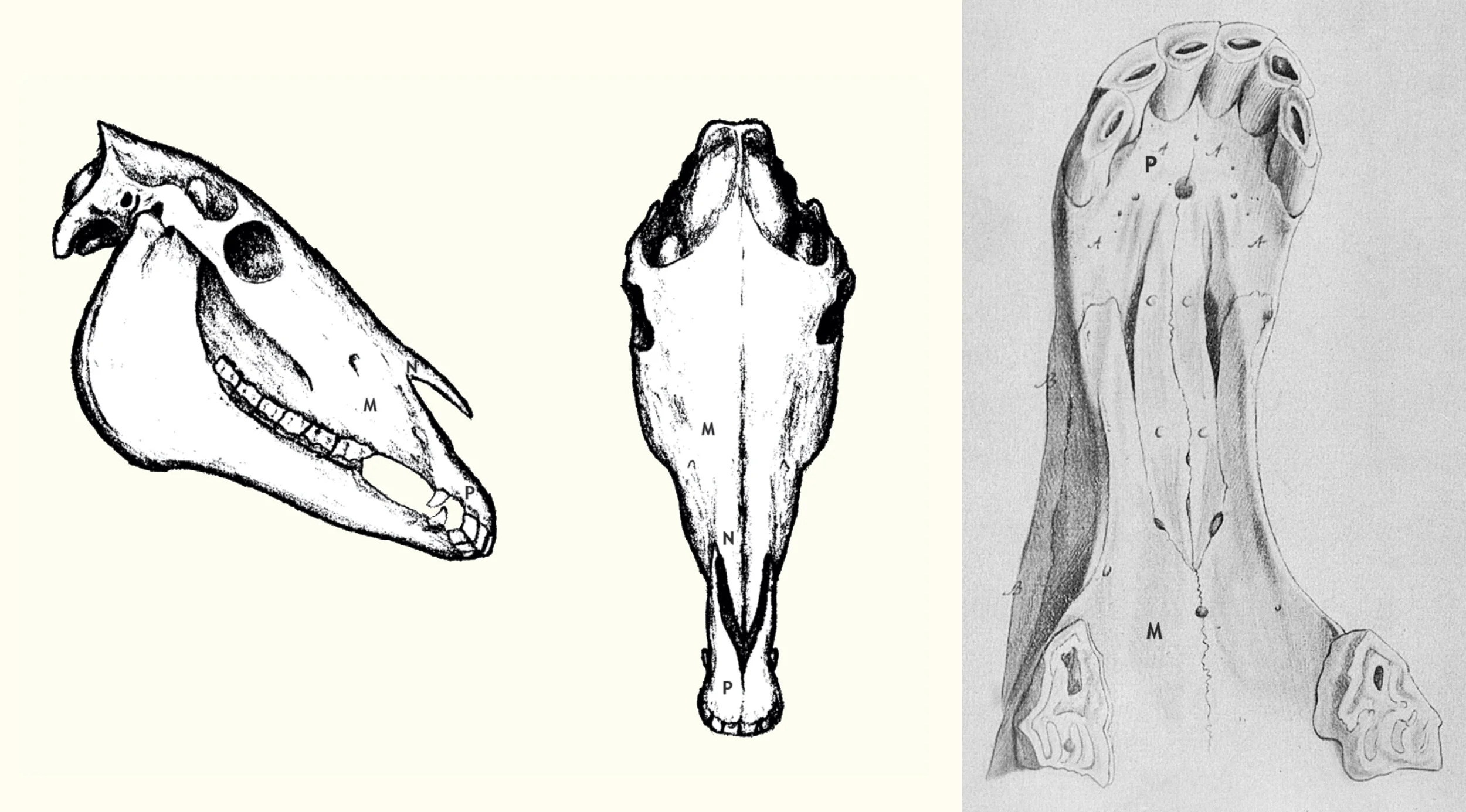 Figure 1. The skull of a horse, showing the premaxillary (P), maxillary (M), and nasal (N) bones. The palate view of the upper jaw at the right is from Goethe’s original publication on the premaxillary bone (labeling added by CH).