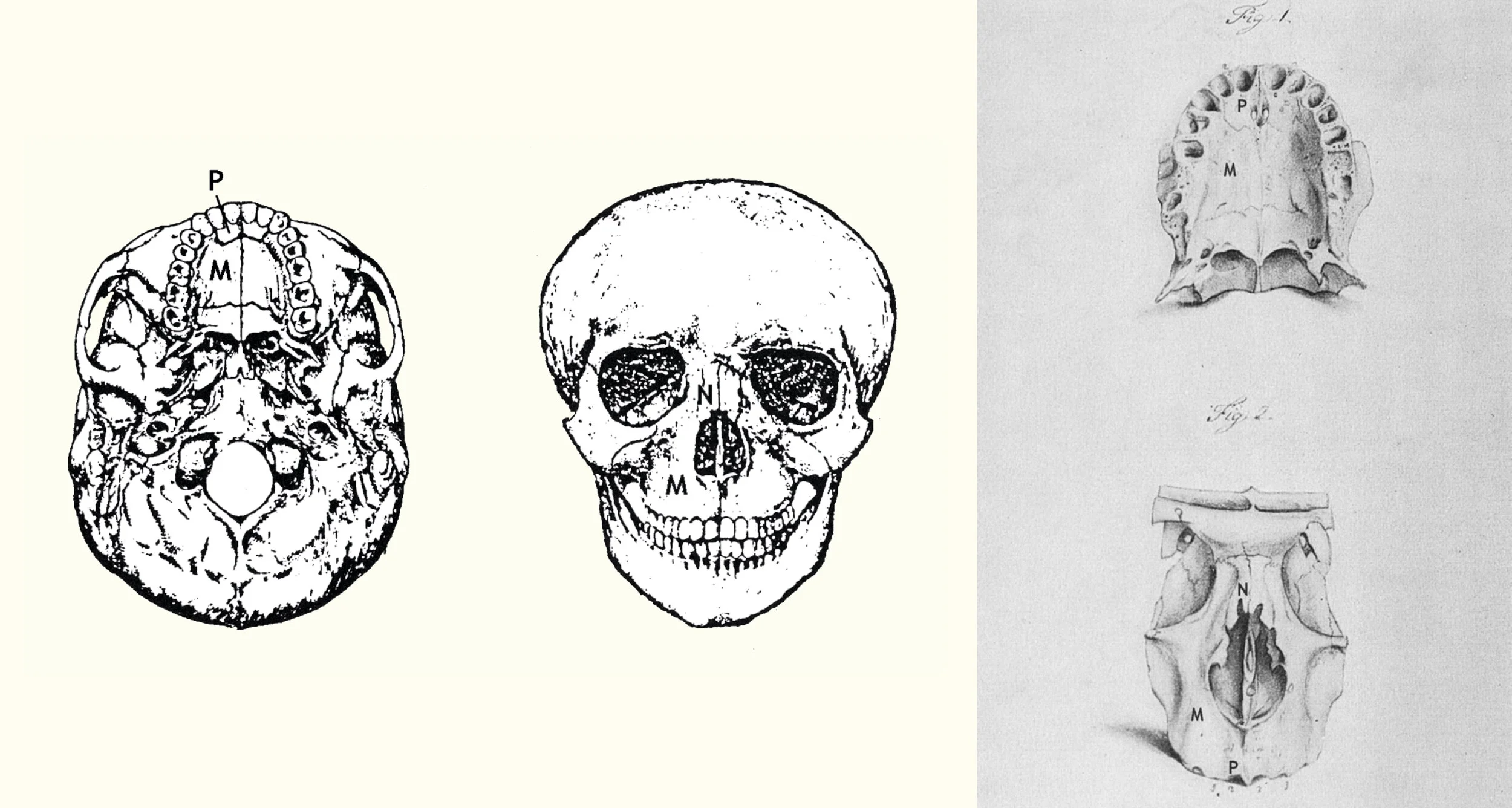 Figure 3. Adult human skulls, showing the premaxillary (P), maxillary (M), and nasal (N) bones. The drawings on the right show two different detail views of the same skull and are from Goethe’s original publication on the premaxillary bone (labeling added by CH); note that on the skull from Goethe's publication, the premaxillary bone is visible both in the view from the outside front of the skull (bottom drawing) and also when looking at the hard palate. In contrast, in the skull at the left, on the outside front of the skull, the sutures of premaxilla and maxilla have fused to create one bone, while the sutures are still visible in the hard palate (top drawing).