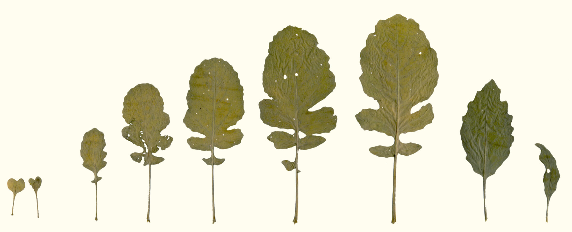 Figure 4. All the leaves from the main stem of a wild radish (Raphanus raphanistrum) specimen. The first leaves develop at the bottom of the plant (at the left in the horizontal row); the small leaf (at the right end of the row) is the uppermost leaf and the last one to develop; it precedes the first flower.