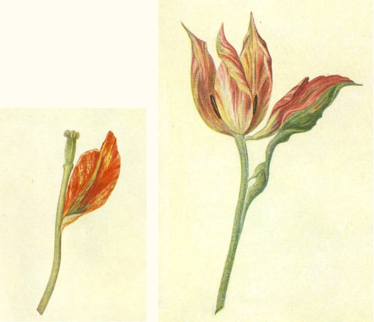 Figure 6. Two atypical tulips. The upper leaf on the stem at the left has the texture and color of a petal. In the specimen on the right the upper leaf and a petal are not wholly separated and this chimeric form has characteristics of both petal and foliage leaf. (Paintings commissioned by Goethe for Metamorphosis of Plants.)