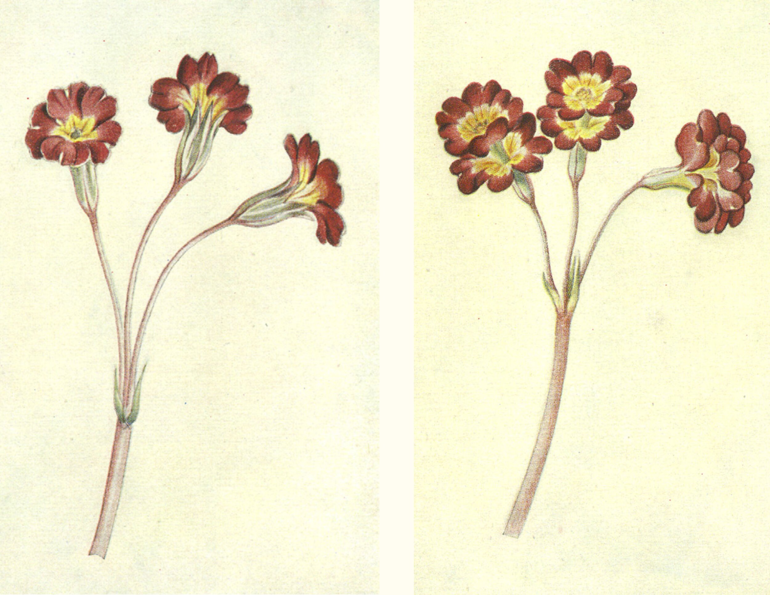 Figure 7. A species of primrose. The flowers of the specimen on the left have the typical tube-like, green calyx that holds the red and yellow petals of the corolla. The atypical specimen on the right has a double layer of petals; the calyx transformed into a corolla. (Paintings commissioned by Goethe for Metamorphosis of Plants.)