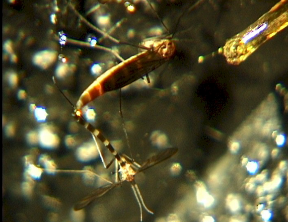 Male and female flies mating adjacent to a pupal casing (upper right) from which the female (top center) has emerged. The two flies form an approximate ‘V’. (Photo courtesy of the Springbrook Glow Worms Research Centre)