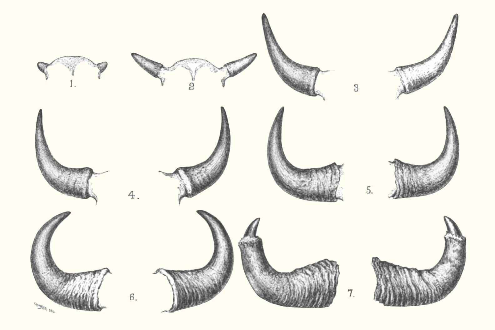 3: spike bull, 2 years old; 4: spike bull, 3 years old; 5: bull, 4 years old. 6: 11 years old; 7: old “stub-horn” bull, 20 year old. (Adapted from Hornaday 1887/2002, Plate VIII)