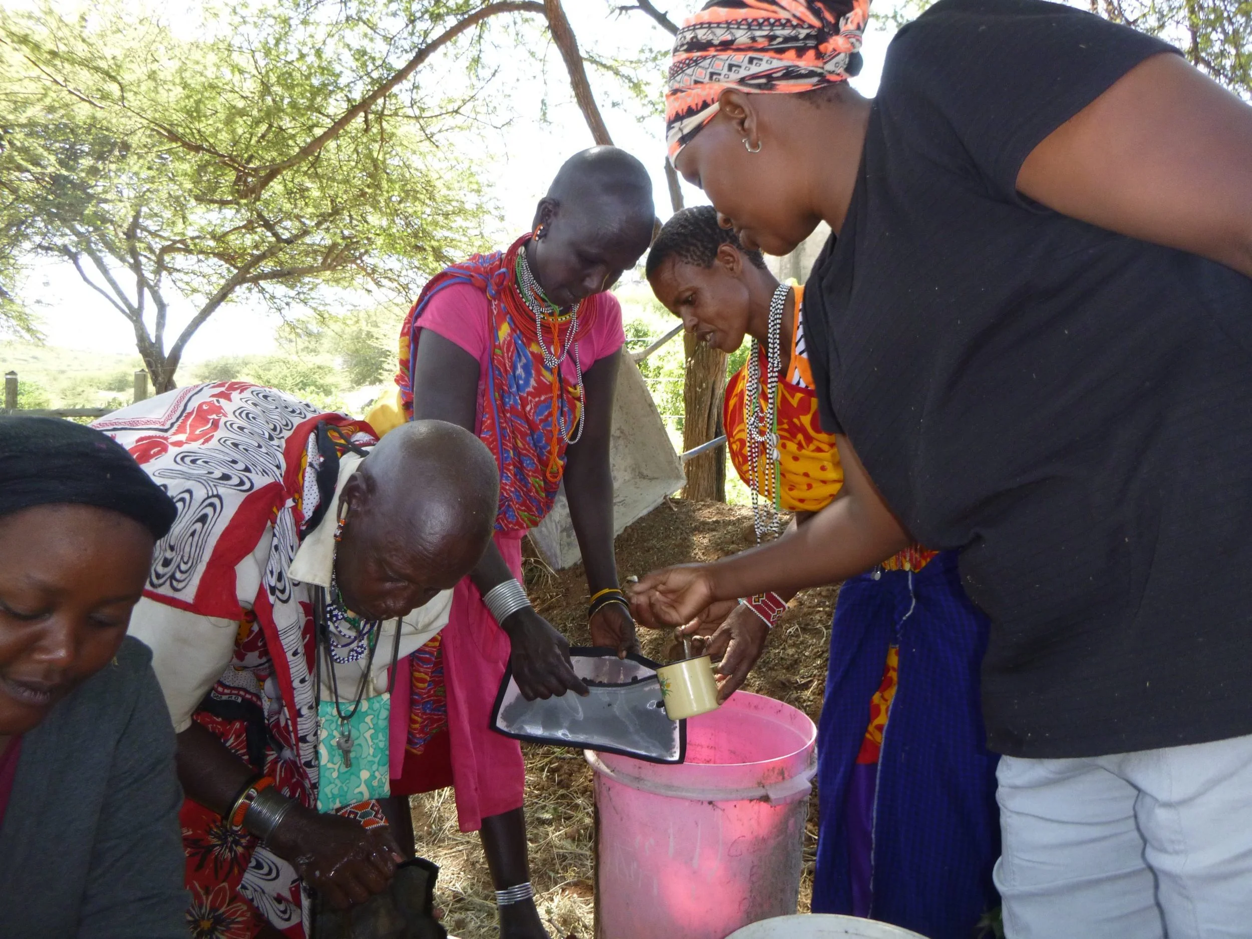 Masai women farmers from Kenya learning to make compost from local materials and liquify it into a soil amendment for their crops. The bag they are holding was specially created by Earthfort for the process. IMAGE CREDIT: Peter Ash
